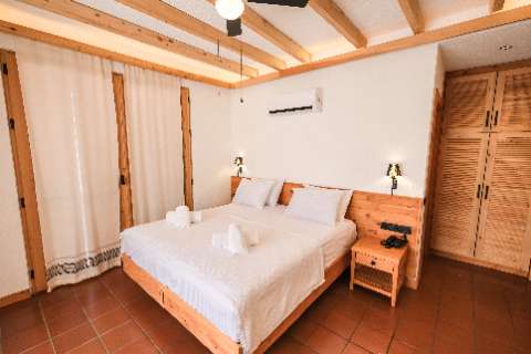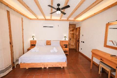 The floors are made of natural terracotta, offering a hygienic and easy-to-clean surface for added comfort. The ceiling, supported by wooden beams, adds a rustic touch to the space.