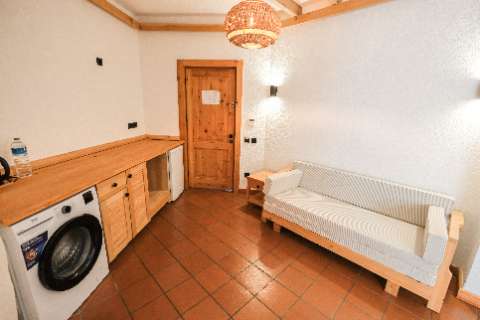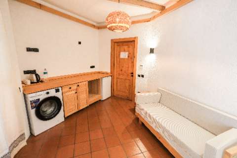 The room includes a workspace, a kettle, refreshments, an electric mini stove, and a washing machine.